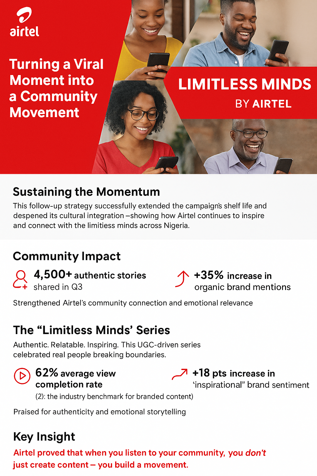 Our strategy was to create a "Narrative Echo" by deconstructing the campaign's success and using those insights to fuel ongoing content. We moved from a single hero story to a platform celebrating limitless stories across Nigeria. The goal was to prove that Farooq's story was not an outlier but an embodiment of a spirit shared by many Airtel users.