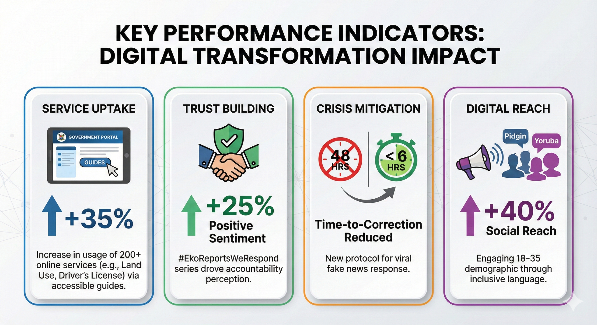 - Trust Building: The #EkoReportsWeRespond series became the highest-performing content category, driving a 25% increase in positive sentiment regarding government accountability on social platforms.